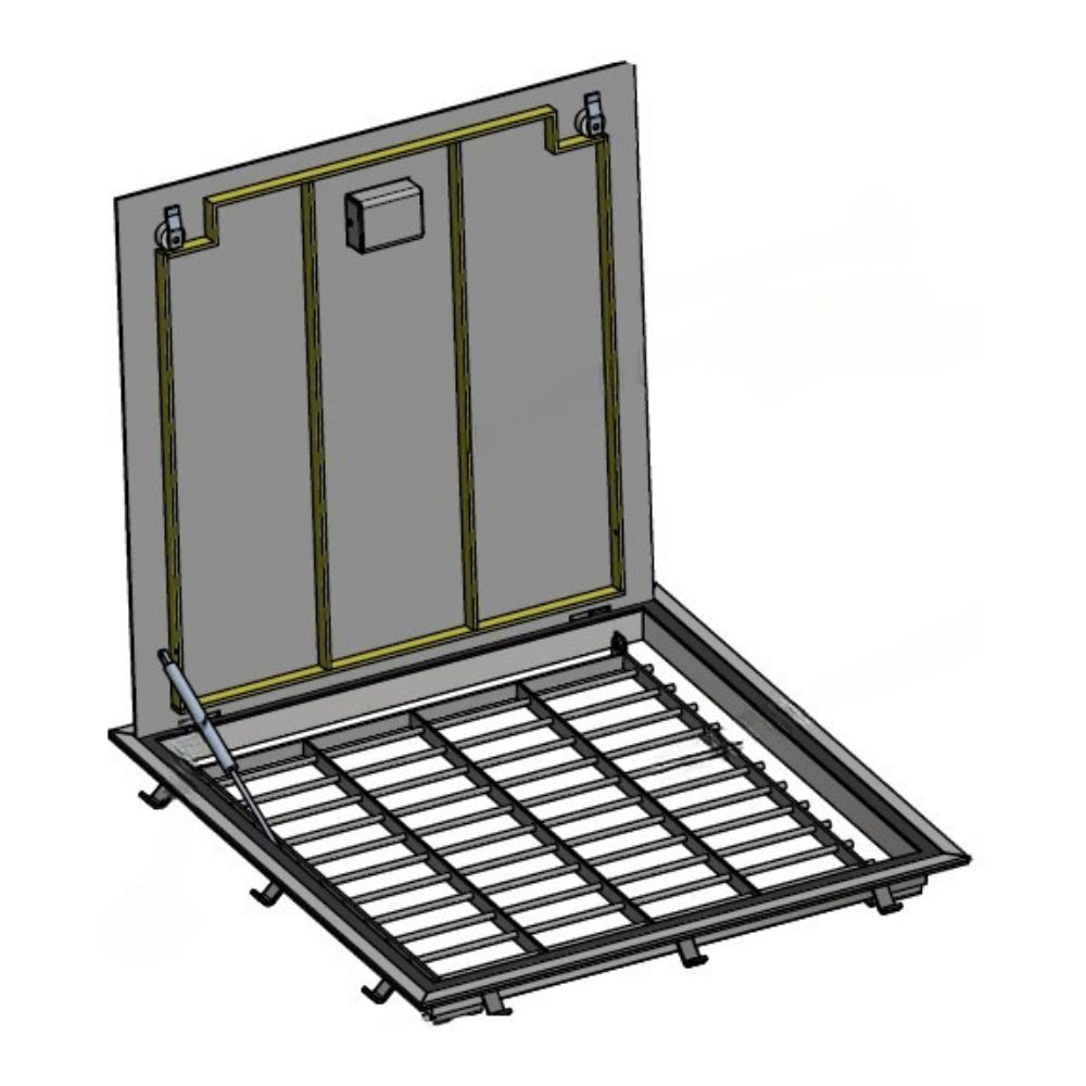 Dit eendelige Tiburon instort vlakluik heeft een RVS 304 inbouwrand. Afhankelijk van de dagmaat heeft het luik een of twee veiligheidsrooster van RVS 304 en een aluminium deksel met een of twee RVS gasveren. De deksels zijn vervaardigd uit ALMG3 5/6 mm dik tranenplaat en zijn versterkt met ribben. Hierdoor zijn de deksel geschikt voor een belasting van 1,5 kN/m². Alle bewegende delen zijn gelagerd met nylon bussen en de neopreen afdichting maakt het luik gasdicht. Het luik wordt geleverd inclusief hangslotvoorziening, knevelsloten, bevestigingsmateriaal en neoprene afdichtband. Op aanvraag is het ook mogelijk om dit luik in RVS 316 uit te voeren.