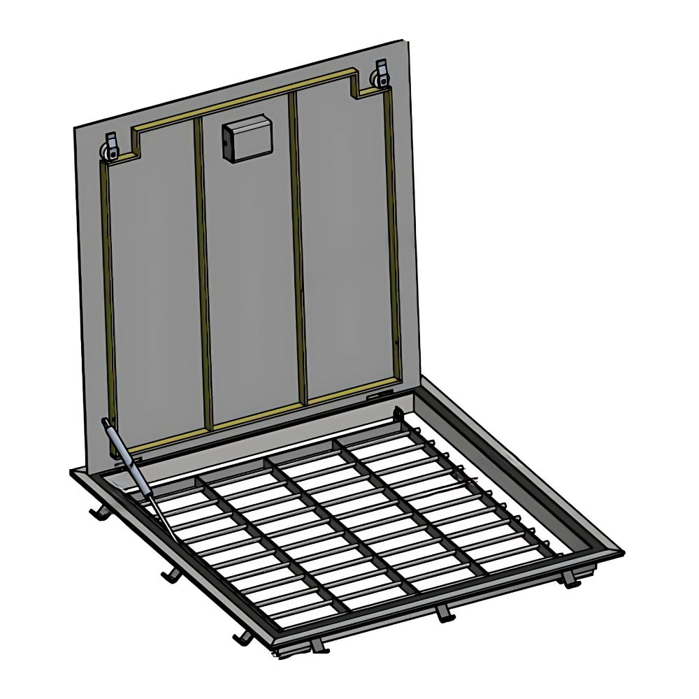 Dit tweedelige Tiburon instort vlakluik heeft een RVS 304 inbouwrand. Afhankelijk van de dagmaat heeft het luik per deel een of twee veiligheidsrooster van RVS 304 en een aluminium deksel met een of twee RVS gasveren. De deksels zijn vervaardigd uit ALMG3 5/6 mm dik tranenplaat en zijn versterkt met ribben. Hierdoor zijn de deksel geschikt voor een belasting van 1,5 kN/m². Daarnaast is het luik uitgevoerd met een volledig uitneembare tussenstijl. Alle bewegende delen zijn gelagerd met nylon bussen en de neopreen afdichting maakt het luik gasdicht. Het luik wordt geleverd inclusief hangslotvoorziening, knevelsloten, bevestigingsmateriaal en neoprene afdichtband. Op aanvraag is het ook mogelijk om dit luik in RVS 316 uit te voeren.